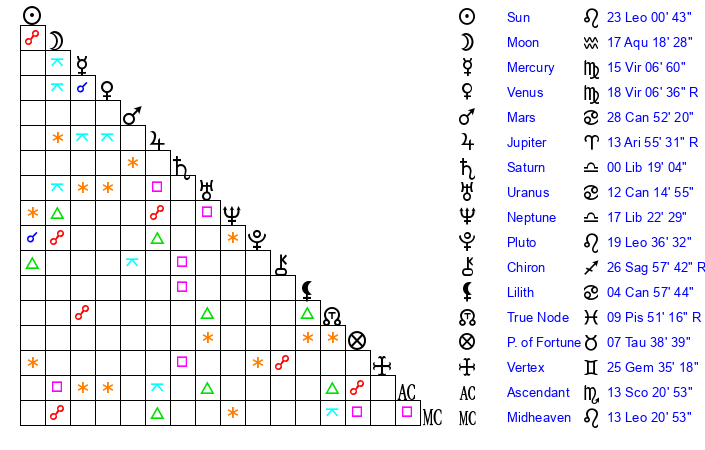 | Pluto | 19 Leo 36 | 2 Aquarius 4 | 21 Leo 24 |