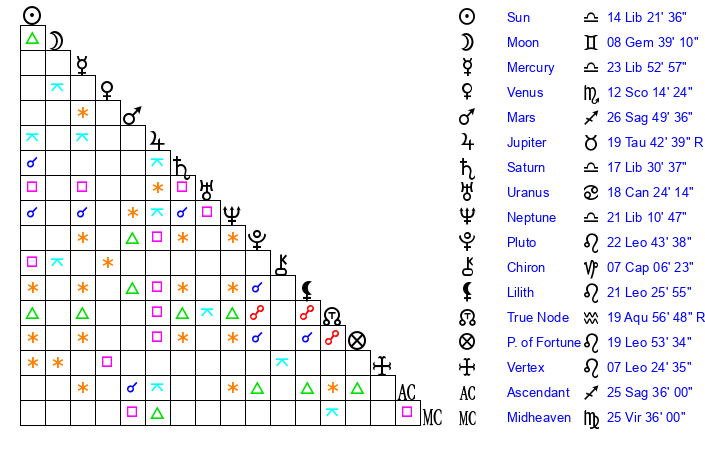 | Saturn | 17 Libra 59 | 27 Pisces 9 | 25 Libra 53 |