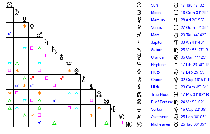 | Sun | 17 Taurus 17 | 18 Taurus 21 | 28 Cancer 7 |