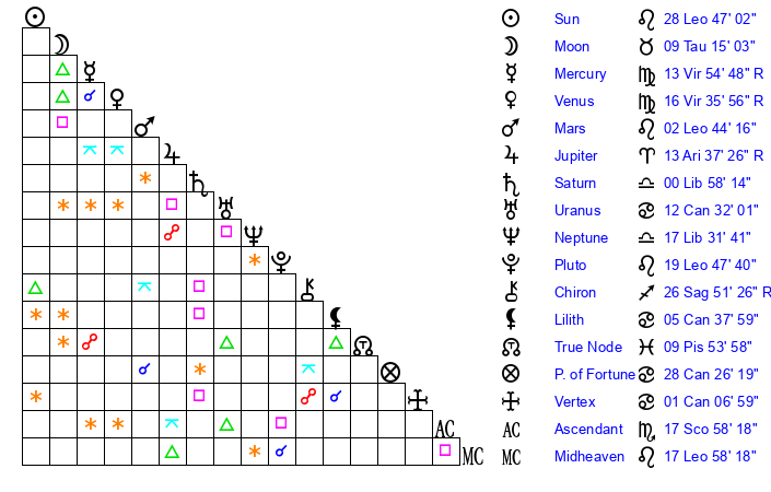 | Pluto | 19 Leo 48 | 1 Aquarius 56 | 21 Leo 28 |