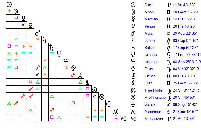 | Sun | 11 Aries 43 | 11 Aries 58 | 14 Gemini 46 |
