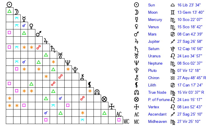 | Moon | 13 Gemini 20 | 22 Taurus 10 | 18 Libra 39 |