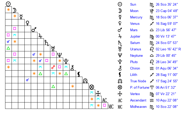 | Sun | 26 Scorpio 35 | 27 Scorpio 37 | 7 Aquarius 45 |