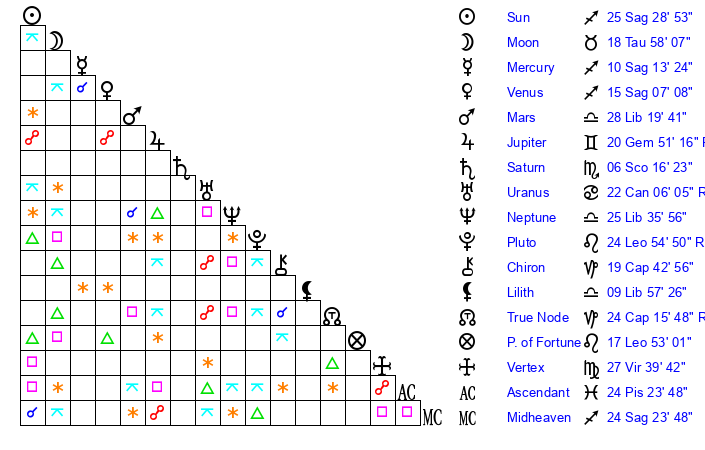 | Moon | 19 Taurus 5 | 0 Sagittarius 8 | 28 Sagittarius 19 |