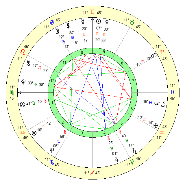 | Moon | 12 Cancer 17 | 29 Gemini 42 | 24 Scorpio 36 |
