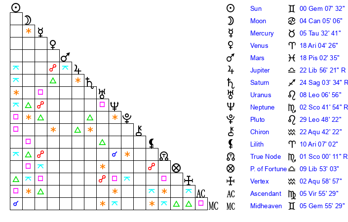 | Sun | 0 Gemini 7 | 0 Gemini 53 | 4 Leo 8 |