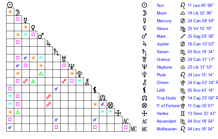 | Sun | 11 Leo 45 | 12 Leo 34 | 20 Libra 48 |