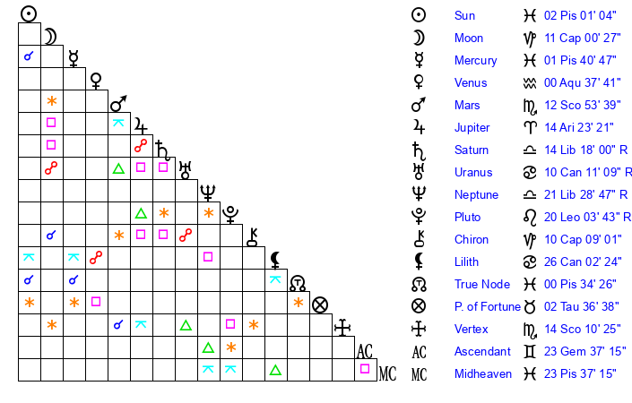 | Neptune | 21 Libra 28 | 28 Pisces 38 | 19 Libra 41 |