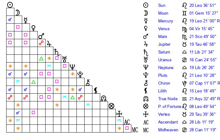 | Mercury | 19 Leo 21 | 4 Leo 31 | 20 Scorpio 46 |