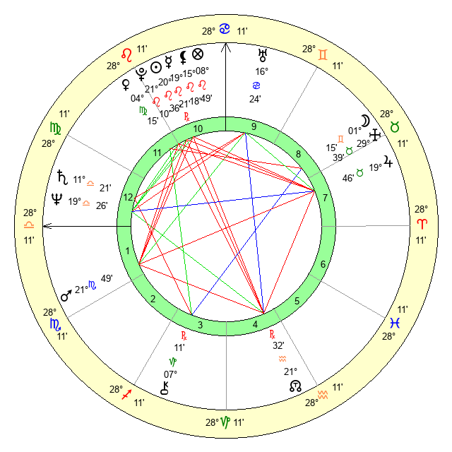 | Venus | 4 Virgo 16 | 15 Cancer 30 | 3 Sagittarius 58 |