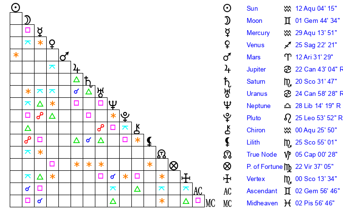 | Sun | 12 Aquarius 4 | 13 Aquarius 5 | 22 Aries 0 |