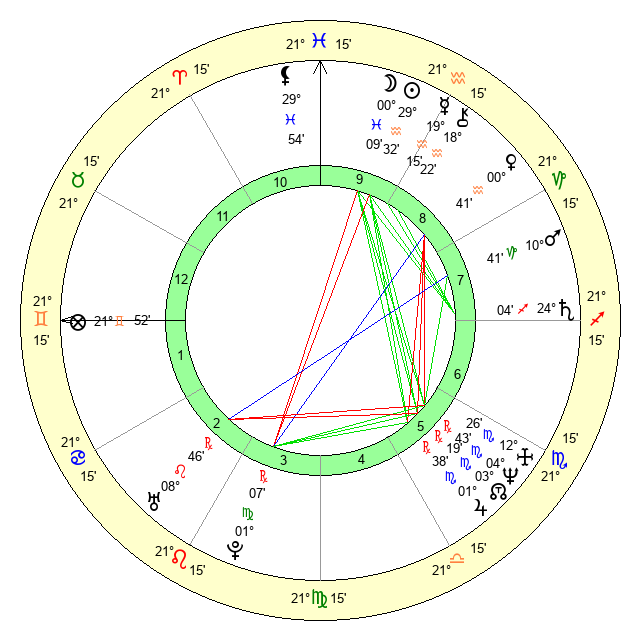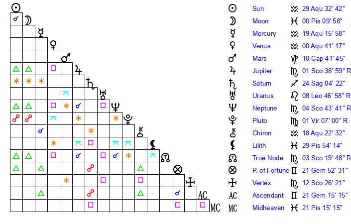 | Sun | 29 Aquarius 32 | 0 Pisces 17 | 5 Taurus 57 |