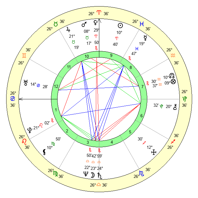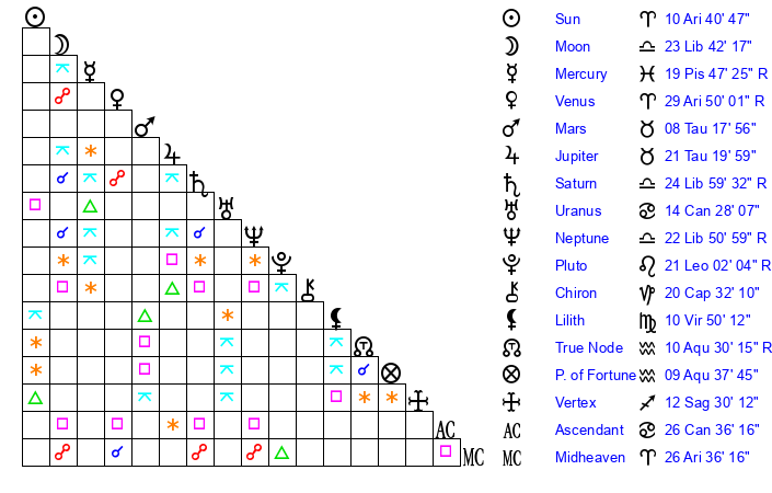 | Moon | 23 Libra 45 | 12 Taurus 59 | 21 Gemini 24 |