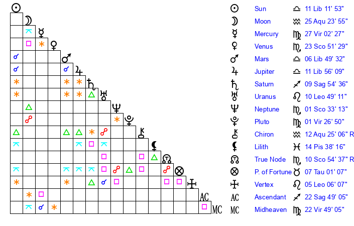 | Saturn | 10 Sagittarius 19 | 27 Pisces 22 | 17 Sagittarius 27 |
