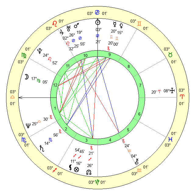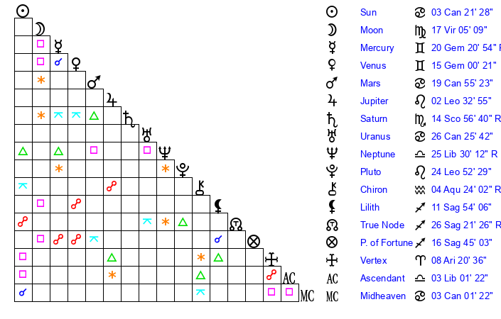 | Moon | 17 Virgo 16 | 8 Cancer 1 | 27 Pisces 30 |