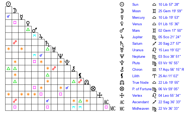 | Mercury | 10 Libra 20 | 26 Libra 58 | 16 Sagittarius 47 |