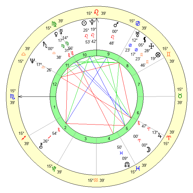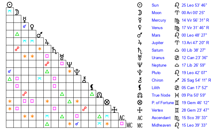 | Mercury | 14 Virgo 56 | 8 Leo 24 | 20 Scorpio 14 |