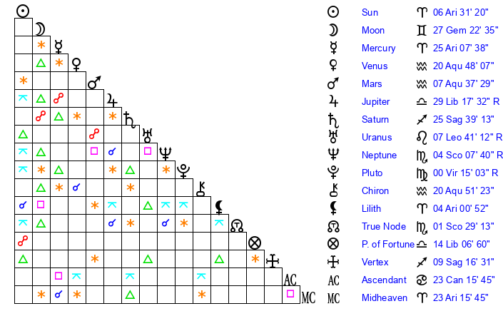 | Moon | 27 Gemini 18 | 12 Pisces 58 | 22 Sagittarius 46 |
