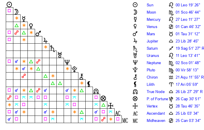 | Uranus | 11 Leo 15 | 0 Gemini 40 | 15 Leo 5 |