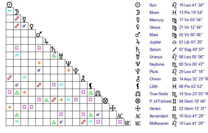 | Moon | 13 Pisces 21 | 3 Aries 42 | 7 Virgo 42 |