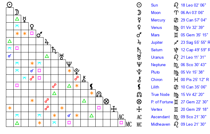 | Neptune | 6 Scorpio 30 | 1 Aries 49 | 8 Scorpio 12 |