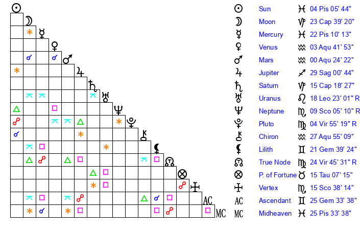 | Moon | 23 Capricorn 47 | 9 Capricorn 27 | 9 Gemini 51 |