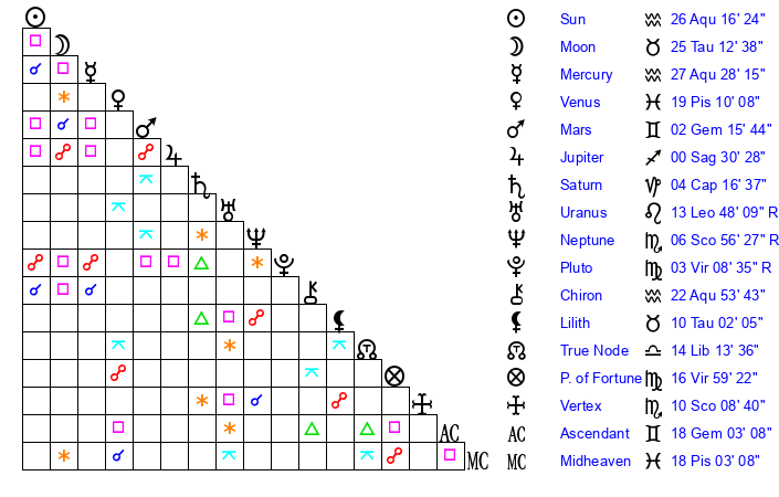 | Sun | 26 Aquarius 16 | 27 Aquarius 16 | 1 Taurus 49 |