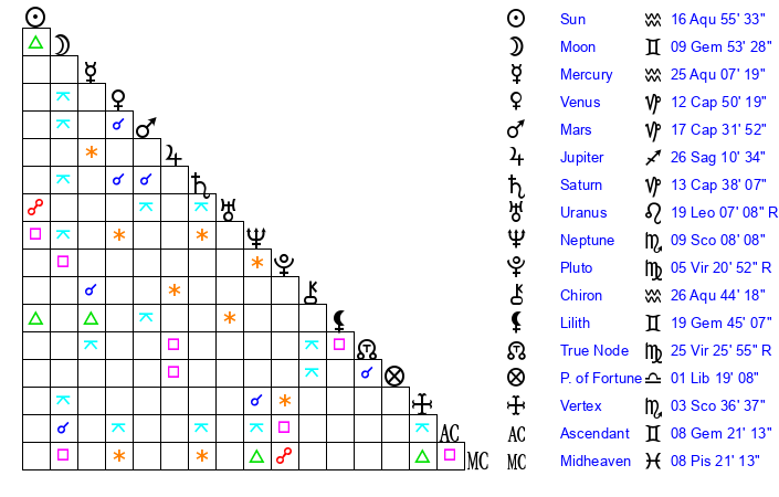 | Sun | 16 Aquarius 55 | 18 Aquarius 9 | 21 Aries 48 |