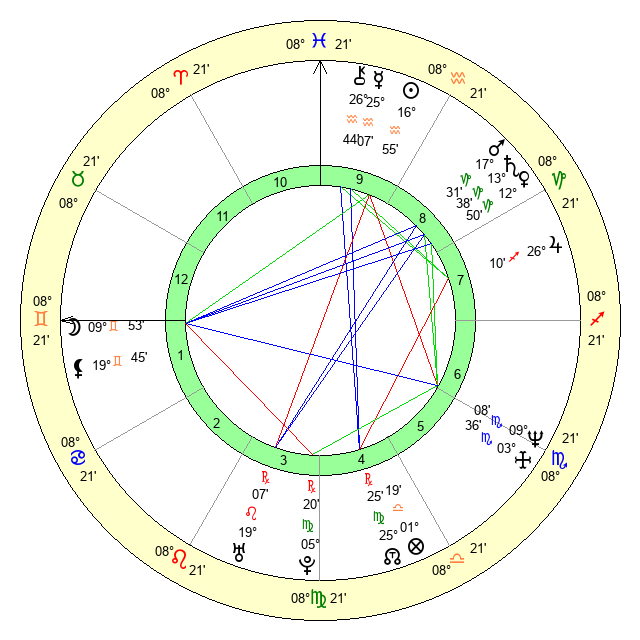 | Moon | 9 Gemini 50 | 6 Gemini 0 | 19 Libra 56 |