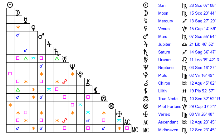 | Neptune | 3 Scorpio 16 | 29 Pisces 28 | 4 Scorpio 45 |