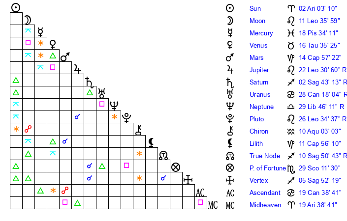 | Sun | 2 Aries 3 | 2 Aries 19 | 9 Gemini 13 |