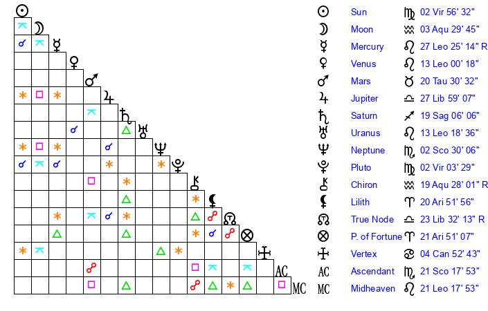 | Pluto | 2 Virgo 3 | 1 Aquarius 51 | 3 Virgo 54 |