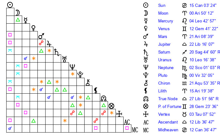 | Moon | 0 Aries 51 | 9 Sagittarius 30 | 8 Virgo 16 |