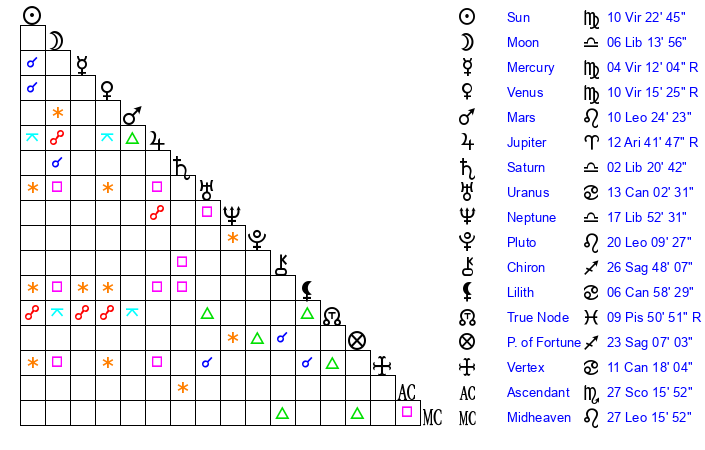 | Venus | 10 Virgo 14 | 10 Leo 49 | 6 Libra 55 |