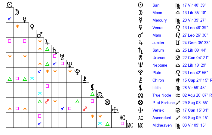 | Mercury | 20 Virgo 39 | 15 Virgo 44 | 15 Scorpio 3 |