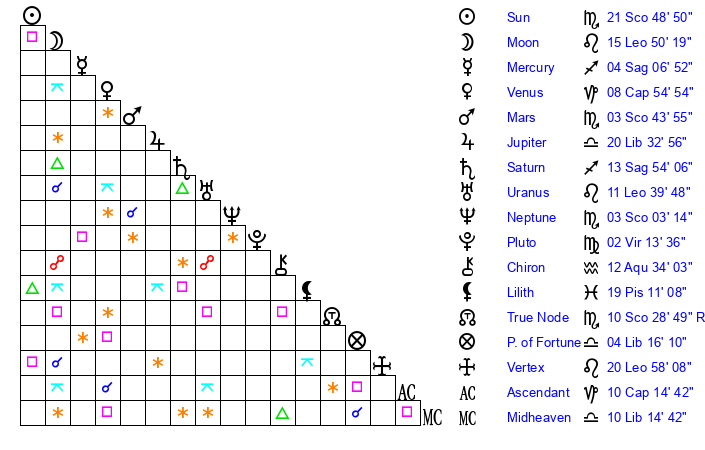 | Sun | 21 Scorpio 49 | 22 Scorpio 19 | 0 Aquarius 54 |