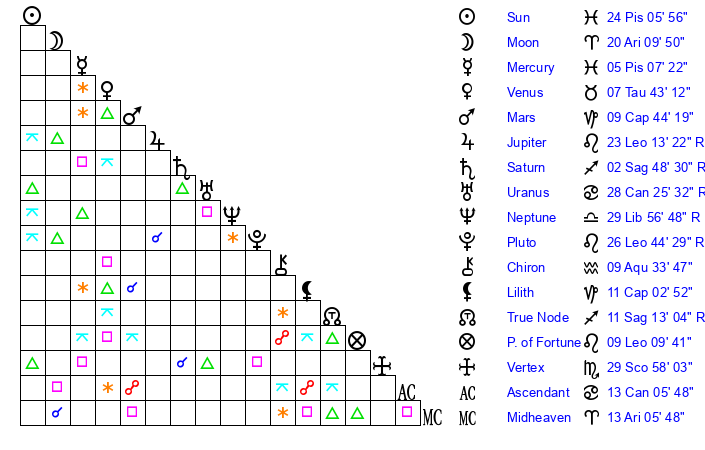 | Sun | 24 Pisces 5 | 24 Pisces 22 | 1 Gemini 33 |