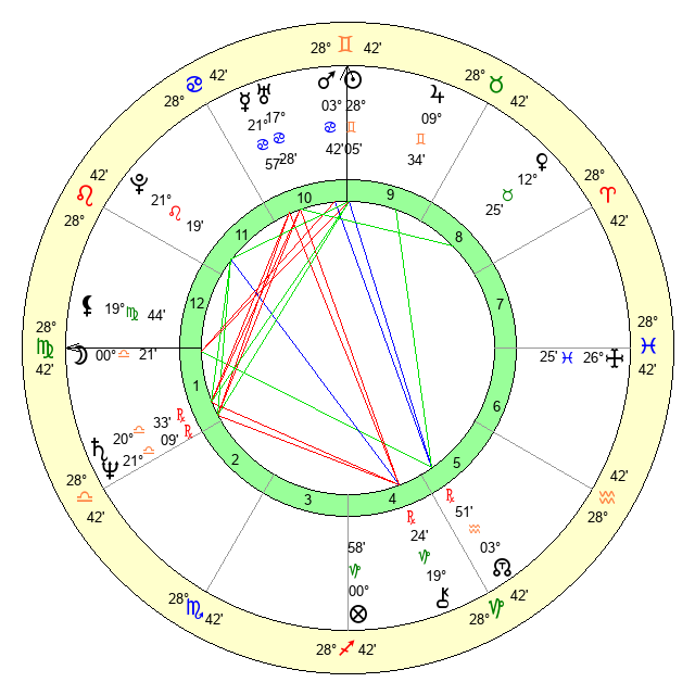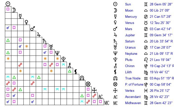 | Sun | 28 Gemini 5 | 28 Gemini 40 | 7 Virgo 0 |