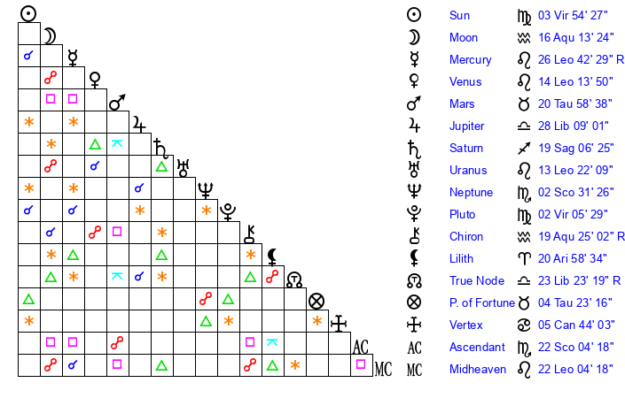 | Sun | 3 Virgo 54 | 4 Virgo 40 | 9 Scorpio 46 |