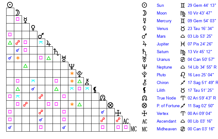 | Moon | 10 Virgo 45 | 9 Taurus 9 | 12 Gemini 57 |