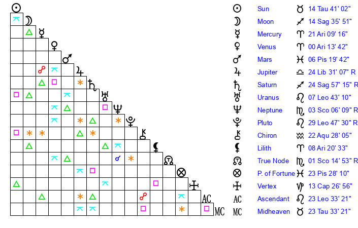 | Moon | 14 Sagittarius 37 | 28 Leo 42 | 18 Taurus 17 |