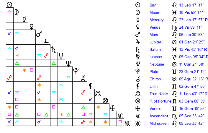 | Mercury | 23 Leo 18 | 5 Leo 21 | 2 Sagittarius 41 |