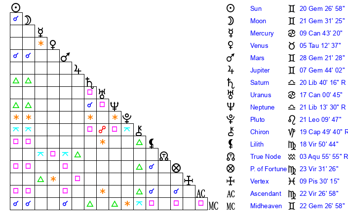 | Sun | 20 Gemini 27 | 21 Gemini 1 | 29 Leo 17 |