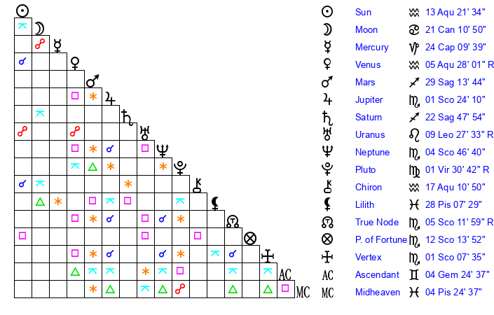 | Sun | 13 Aquarius 21 | 14 Aquarius 6 | 20 Aries 19 |