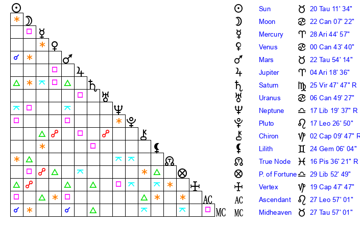| Venus | 0 Cancer 43 | 7 Aries 16 | 11 Virgo 59 |