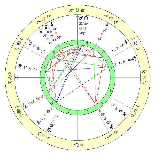 | Mars | 22 Taurus 54 | 10 Leo 40 | 13 Cancer 51 |