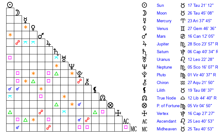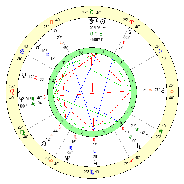 | Moon | 26 Taurus 43 | 4 Libra 51 | 23 Libra 14 |