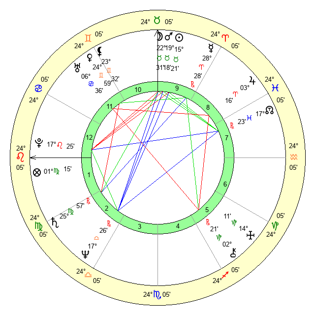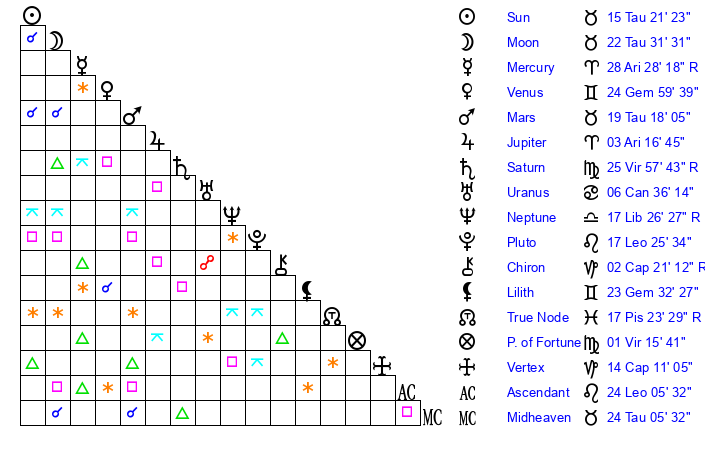 | Moon | 22 Taurus 24 | 10 Virgo 57 | 8 Aquarius 52 |