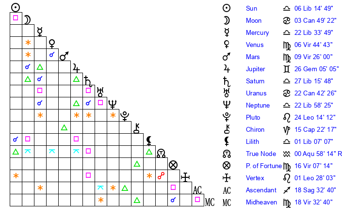 | Saturn | 27 Libra 44 | 27 Pisces 44 | 6 Scorpio 4 |