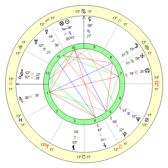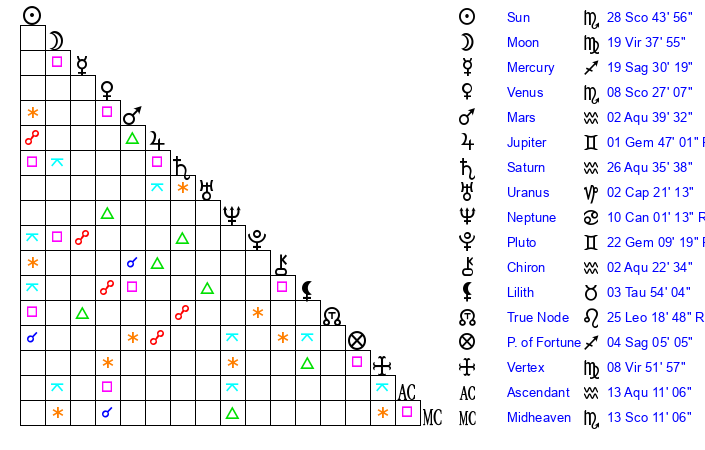 | Moon | 19 Virgo 42 | 15 Sagittarius 11 | 22 Aquarius 6 |